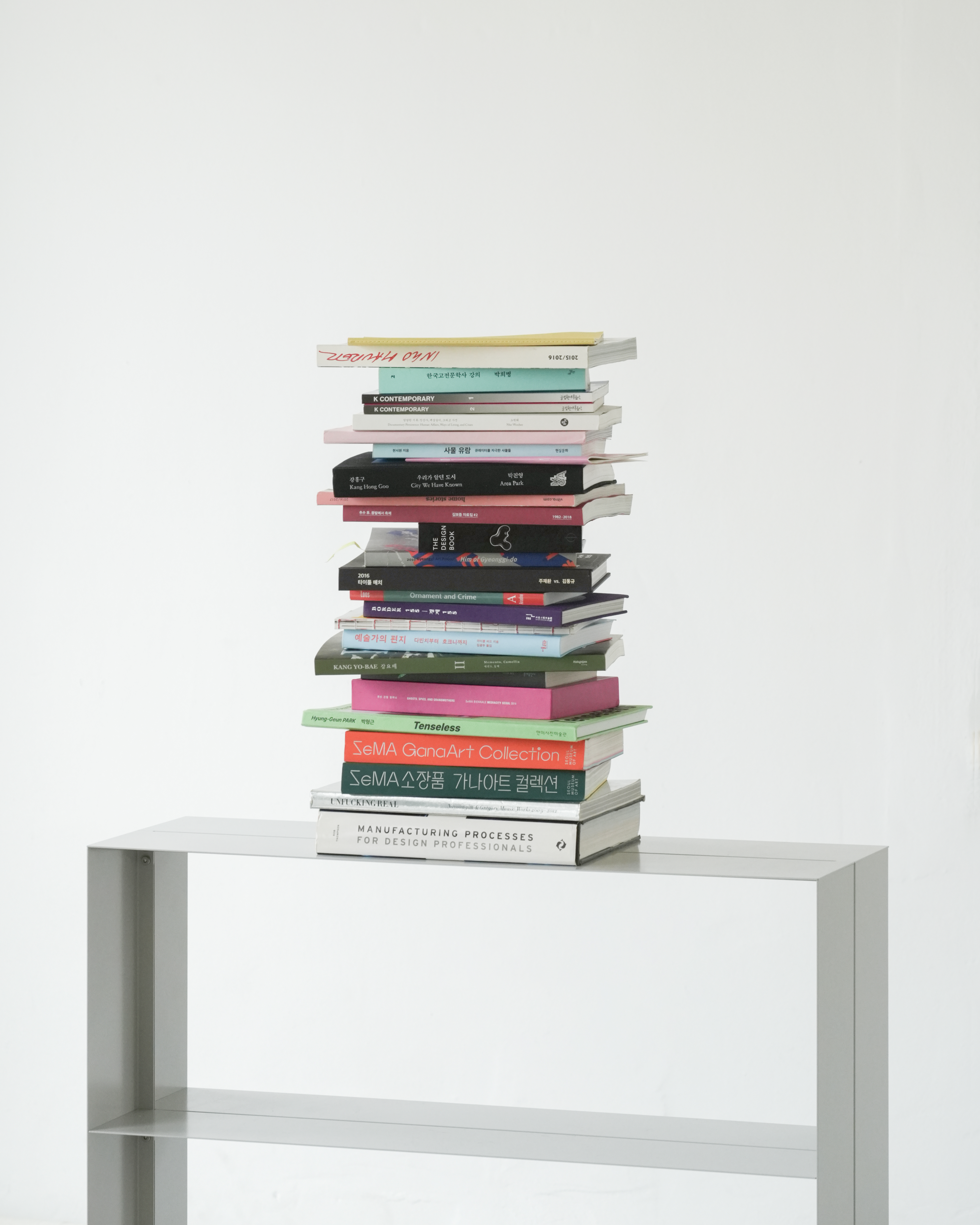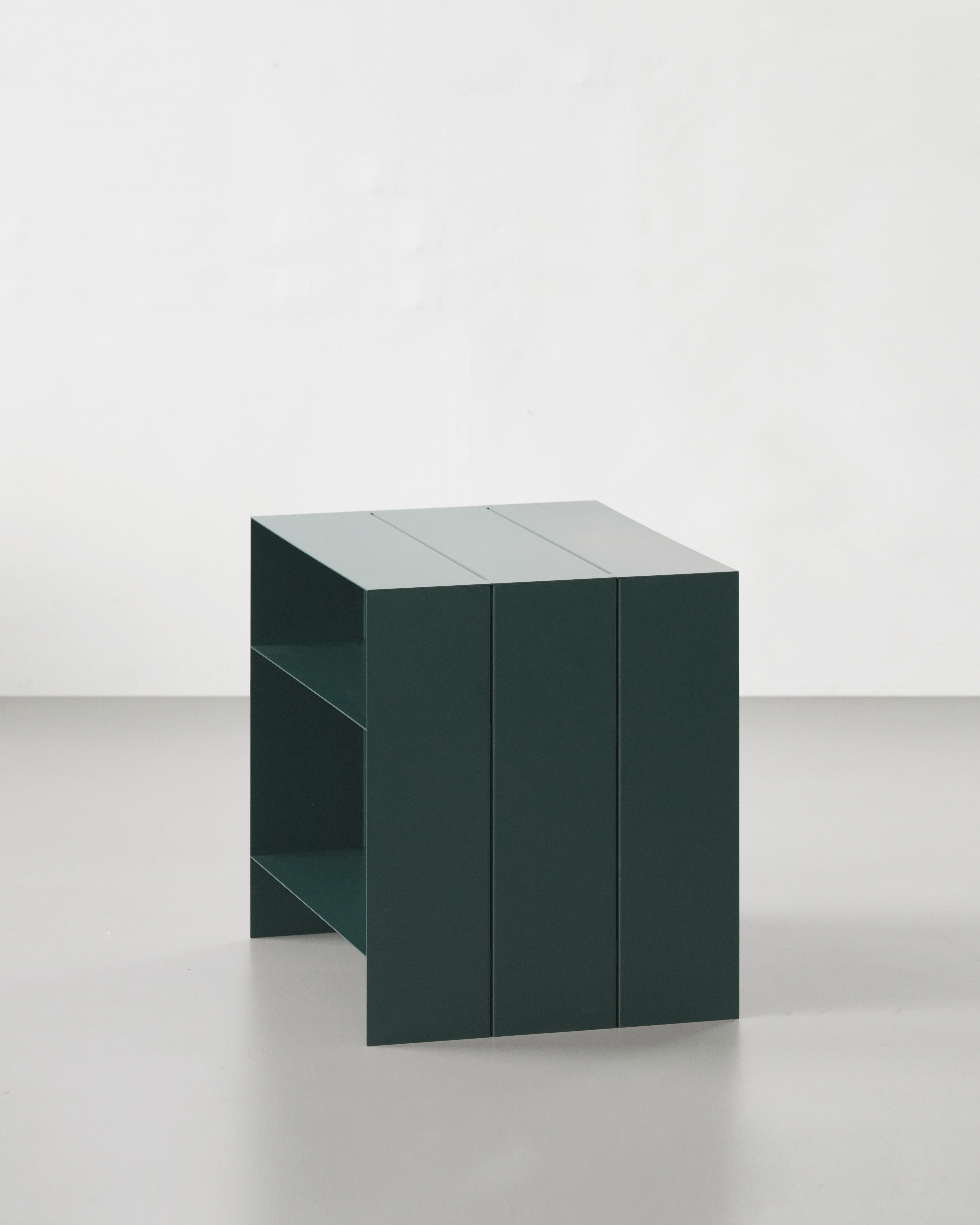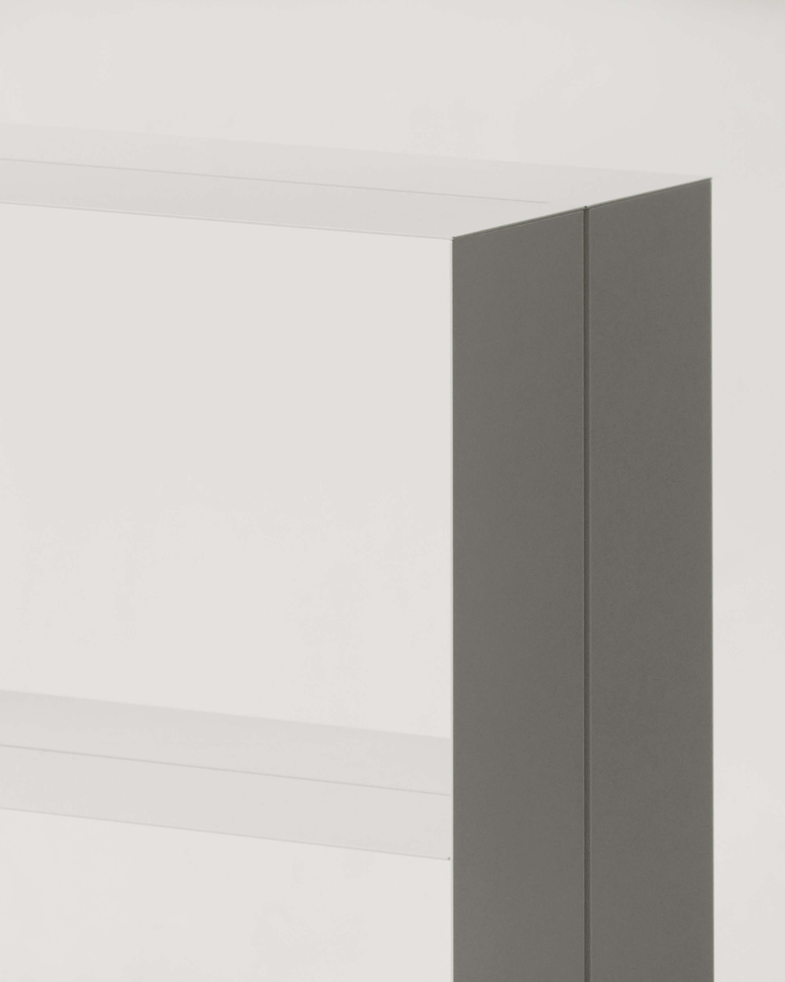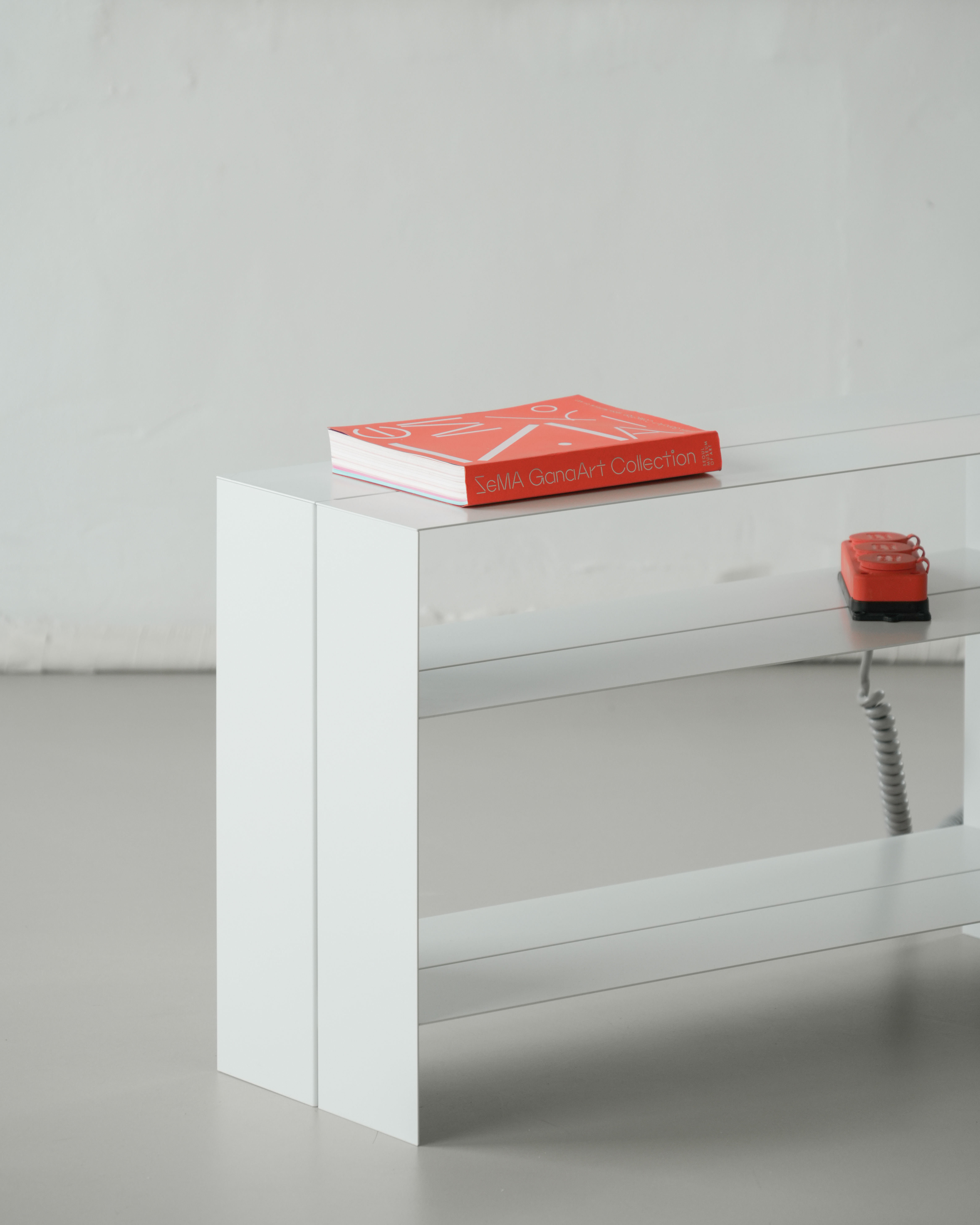 The assembly joints of the “T shelf” are positioned at the center and underside of the shelf and wall. Thanks to this placement, no matter from which angle the user views the furniture, the assembly joints remain hidden, and only the thin silhouette of the metal panels is visible. As a result, from a distance, it creates the illusion of a minimalist piece of furniture made from paper.